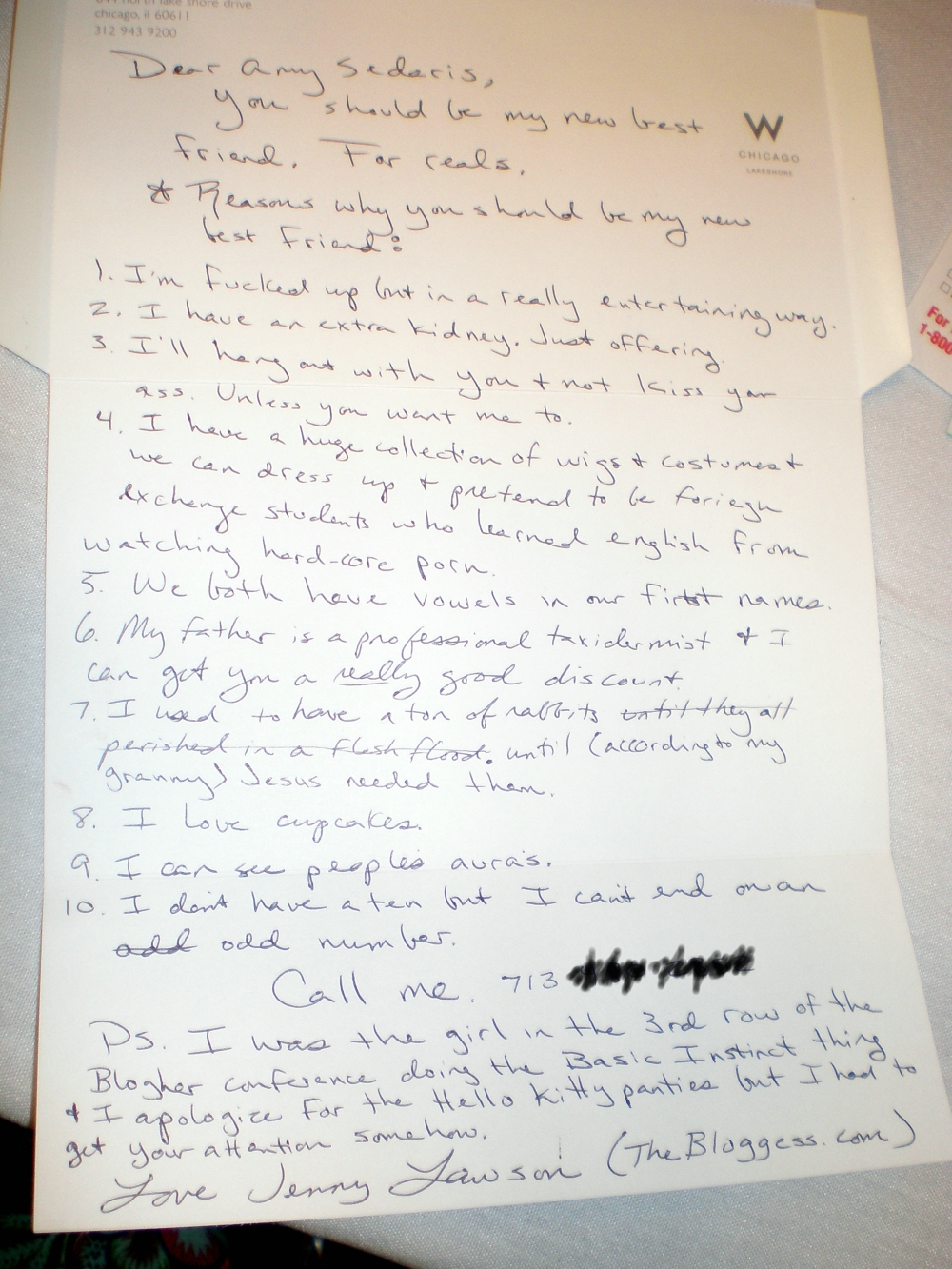 Jesus Christ, that’s some serious batshit crazy you spewed out and actually handed to her. Like what the hell was she supposed to do? Be all OMG MUST CALL HER NOW!!!!11 What celebrity would *ever* do that? Writing a note back to someone who wrote is one thing, but calling a fan is probably never going to happen. You crossed a serious line and quickly got filed into her crazy fan category.