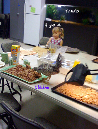 Oh, my goodness. I don’t know what’s funnier…the mistaken scientist, the chicken perched on your shoulder like a misinformed parrot or the bbq larvae.