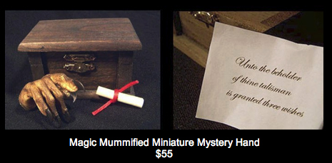 Also? I find it curious that just your good ole fashioned mummified hands come at a pricier rate than the hand that also comes with three wishes. How does this make sense?!