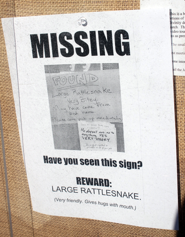 You should also leave a sign at every stop sign in the neighborhood so that people can see them coming to and from work. Have you contacted Sting, Quincy Jones, or Bono about possibly writing a “We are the Lost Rattlesnake Sign” song?