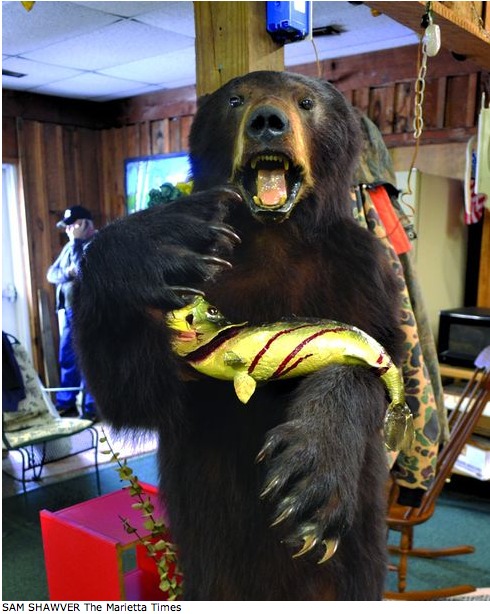 The guy on the phone in the background is totally calling the cops to report the crazy lady staring at a taxidermied bear while muttering something about “hair” and “bears” and Photoshopping fish. You’ll notice that he has his hand over the mouthpiece because crazy people are notoriously good at reading lips, particularly the words, “send the men in white coats.”
